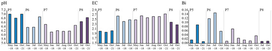pH, electrical conductivity (EC) (mS/cm) and Bi (µg/L) levels in the groundwater from wells P5, P6, P7 and P8, sampled between 2016 and 2021.