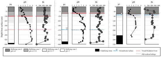 pH and solid Bi concentrations (mg/kg) in the tailings profiles from cores P4, P5 and P7, modified after [25].