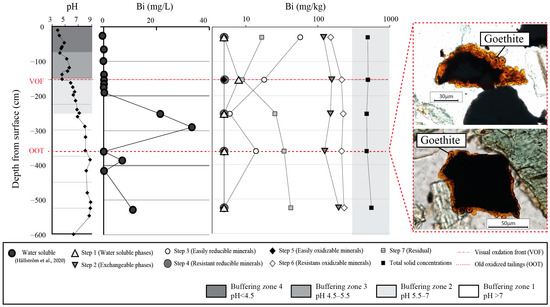 pH and water-soluble Bi concentrations (µg/L) in tailings core P4, modified after [39], Bi released in core P4 during the seven-step sequential extraction (this study), and goethite presence determined by Raman spectroscopy in old oxidized tailings [39].