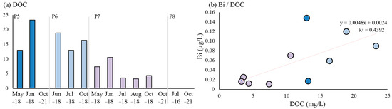 (a) Dissolved organic compounds (DOC) data published by [45], and (b) the correlation between dissolved organic carbon (DOC) and Bi in the groundwater of wells P5, P6 and P7.