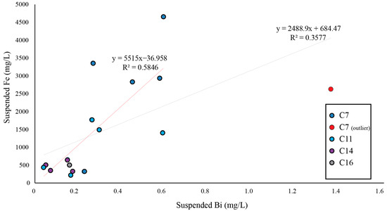 Relationship between suspended Fe and Bi in the surface water downstream of the Smaltjärnen repository. The different R2 values represent the inclusion/exclusion of the C7 outlier marked in red. See Figure 9 for sample locations.