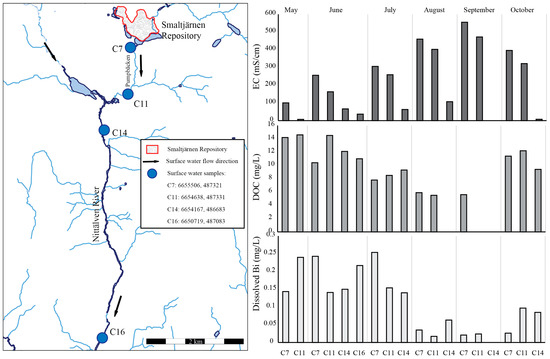 The small part of Bi that did not adsorb to Fe (hydr)oxides was transported in the dissolved phase more than 5 km from the Yxsjöberg mine site. When correlating surface water data regarding DOC [45] and dissolved concentrations of Bi [26], a likely, but not significant, relationship between the two was observed (p-value 0.08), as can be seen in Figure 9. The lowest concentrations of Bi were detected when the EC levels were at their maximum, and the highest concentrations were detected during the spring flood (Figure 9) when all other elements were diluted by the high water flow [39]. The spring flood contained elevated concentrations of dissolved organic matter (DOC), and it is likely that organic matter has formed strong complexes with Bi, keeping it mobile in the downstream surface water with a neutral pH. Thus, dissolved Bi was transported more than 5 km from the mine site [26].