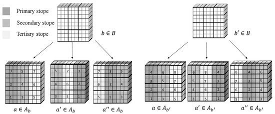 Three data processing steps are needed to generate the inputs necessary to the proposed two-stage SIP as shown in Figure 1, and summarized as follows. The first preprocessing step generates different mining zone configurations by dividing the mining zone into different mining fronts and sublevels according to allowable stope and sublevel dimensions; that is, shapes that reflect operational and geotechnical parameters. Crosscuts c are developed within each mining front, parallel to a defined mining direction. Drifts d are developed perpendicularly to the cross-cuts. The approximated dimensions of crosscuts and drifts , as well as the length from the surface to the access point of a haulage system h and its respective mining zone configurations , for each sublevel . In the second preprocessing step, shown in Figure 1, for each configuration b, stope type options are generated. Each stope type option defines a possible ordering of primary, secondary, and tertiary stope types , as exemplified in Figure 2. Each stope is identified by an indicator parameter , according to its type. Therefore, the set of predecessors of a stope can be defined following geotechnical constraints. Along these steps, the stopes are assumed to fully occupy the space between the sublevels. To manage dilution, in the third step, the profitability of having stopes with heights that are smaller than the distance between sublevels and greater than the minimum stope height is evaluated. Thus, for a given mining zone configuration b, a stope type option a, a stope j, and elements the economic value of each stope is calculated, as shown in Equation (1), for all its possible vertical dimensions and for each simulated orebody scenario s. A probability of non-exceedance threshold (e.g., P50) is predefined, and only the economic value that corresponds to that threshold ( is analyzed. The final stope heights are those that maximize the probabilistic economic value of a stope (, as in Equation (2), as follows: