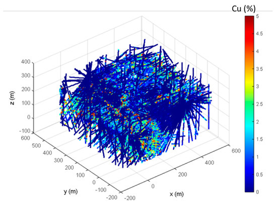 The realizations of the copper deposit using the high-order sequential simulation (HOSIM) method are conducted in a grid size of 5 m × 5 m × 5 m with 466,560 nodes. In order to generate the simulations, 1510 exploration drill holes with 5 m composites are spatially distributed as fans, with centers at approximately every 30 m, which are used as the sample data, as shown in Figure 3. In addition, a training image (TI) generated from densely sampled blast hole data was used. A set of 20 high-order sequential simulations is generated in point support and then goes through the previously described preprocessing steps to generate the inputs to the proposed optimization method. From this set, 10 simulations are used directly as an input to the optimization and the remaining 10 simulations are further used for the risk analysis of the related forecasts. The number of simulations follows previous studies that show that 10–12 simulations are sufficient to produce stable results for mine planning optimization [37,67,72].