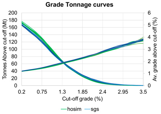 Grade-tonnage curves for simulated copper deposit using SGS and HOSIM, for stopes 15 × 30 × 40 m3.