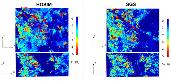 Ten simulations of the copper deposit, using the same exploration data, are generated based on the sequential Gaussian simulation (SGS) method, to be used as a means of comparison to the ones obtained using HOSIM. Figure 4 shows the grade-tonnage curves for the two sequential simulation frameworks being compared, considering the minimum stope dimensions (i.e., 15 m × 30 m × 40 m). The blue and green curves in the graph overlap each other for some of the simulated scenarios indicating that, for both methods, the grade and tonnage proportions are similar. Thus, the simulation method does not directly impact the metal quantities. Figure 5 shows cross-sections of simulations using high-order and Gaussian sequential simulations. A visual inspection indicates that both realizations reproduce the spatial distribution of copper grades of the exploration data. However, the realization generated with the SGS shows a more dispersed behavior, representing the effect of maximum entropy when the data is transformed into Gaussian space. The highlighted high-grade areas show better connectivity for the realization generated with HOSIM, as expected.