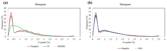 Histograms of samples (red), TI (green), (a) HOSIM realizations (grey), and (b) SGS realizations (blue).