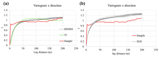 Variograms in x direction of samples (red), TI (green), (a) HOSIM realizations (grey), and (b) SGS realizations (grey).