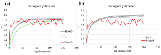 Variograms in y direction of samples (red), TI (green), (a) HOSIM realizations (grey), and (b) SGS realizations (grey).