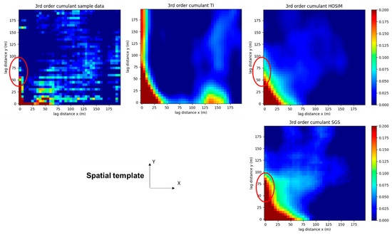 Third-order cumulant maps of sample data, the used TI, HOSIM simulated realization, and SGS simulated realization, where areas highlighted in red show differences in cumulative maps.