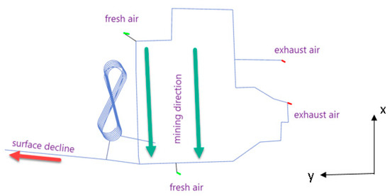 Plan view of the developed infrastructure, where the green arrow indicates the mining direction and the red arrow indicates the direction to the surface decline.