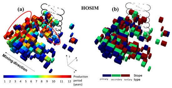 (a) Extraction sequence and (b) final stope types using input realization from HOSIM, red circles highlight the correspondent high-grade areas.