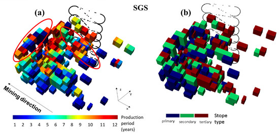 (a) Extraction sequence and (b) final stope types using input realization from SGS, red circles highlight the correspondent high-grade areas.