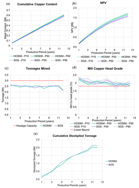 Risk profiles for (a) cumulative recovered copper, (b) NPV, (c) total tonnages mined, (d) mill copper head grade, and (e) cumulative stockpiled tonnage.