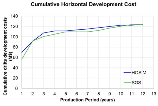 Figure 14 shows the risk profiles considering the decisions optimized using the different inputs with 10 additional high-order sequential simulations. The results are presented in terms of P10, P50, and P90, representing the 10th, 50th, and 90th percentiles of the related performance indicators, respectively. Figure 14a shows that the produced copper content is 4% higher when the realization generated with the HOSIM method is the related input. This can be explained by the maximum entropy that the Gaussian-based approaches generate with respect to the high grades. Thus, after the optimization process, it is observed that the high-grade areas are a better target when a better representation of extreme grade continuity is given as input. The copper production impacts directly on the NPV, which is 6% higher for the HOSIM case compared to the SGS case, as shown in Figure 14b. Although the mined tonnage is similar for both cases (Figure 14c), the cumulative stockpiled tonnage is approximately 5% higher for the SGS case (Figure 14e), which means that the use of the stockpile is necessary to achieve the grade blending requirements, incurring higher rehandling costs. Figure 14d shows that grade blending requirements are overall achieved for both cases, with probable deviations from the lower bound for the SGS case. As previously inferred from the extraction sequences (Figure 12 and Figure 13), in the SGS case, the areas closer to the access points are privileged. In the graph displayed in Figure 15, the horizontal development costs for the SGS case are, in fact, lower for early periods. However, the total horizontal development cost is similar for both cases. Considering the ability of the optimization process to decide whether to stockpile mined material or not and when over the life of this mine, the analysis demonstrates that, in both scenarios, it is profitable to direct material to stockpiles, given the associated rehandling costs. This strategic choice results in an optimal NPV and minimum deviations from the required lower bound of copper grade. Figure 16 shows the number of active stockpiles and tonnage left at the stockpiles for each period and for each case, assuming that multiple stockpiles can be used to assist in the selection of the stockpiled material to be processed. The maximum yearly stockpiling capacity of 400,000 tons is respected and a maximum of three active stockpiles are needed for both cases. This finding underscores the significant role of stockpiling decisions in long-term mine planning, as they can conform to operational considerations and requirements.