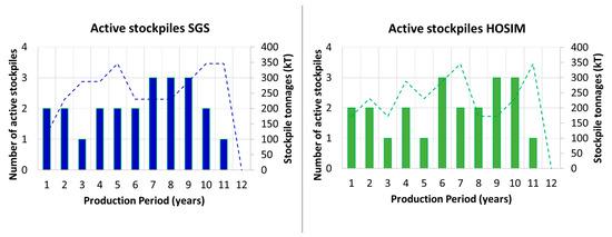 Number of active stockpiles (vertical columns) and tonnage left at the stockpiled for each period (dashed lines).