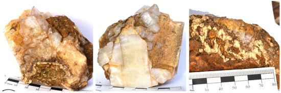 Rhombohedral calcite is present together with quartz-amethyst as holohedral crystal nests alongside the sulfide channels (Figure 2). Jáger et al. [31] reported that the mean temperature of primary fluid inclusions was 129 °C (range 98–145 °C), which does not contradict the observed temperature range of recent vent localities from that water depth [33].