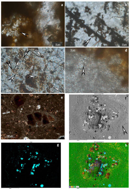 Brown, woven goethite-rich mineralized microbial biosignatures are shown by arrows (a–d), on (c) well-preserved and mineralized remains of diverse sequential filaments with pearl necklace-like, vermiform inner signatures are shown by normal arrows, and coccoid-like forms are shown by dashed arrows, transmitted light, 1 Nicol (1 N hereafter), sample 1, 4, 12; (e) Microfossil in a fine-grained clay-rich matrix transmitted light, 1 N, sample 13; (f) Backscattered electron image (BEI hereafter) obtained by SEM–EDS of the stromatolitic structure around the proposed cross cut of the hydrothermal discharge system, sample 1; (g) Native sulfur occurrence in the stromatolitic structure detected on the S elemental map, sample 1; (h) Composed elemental map of (f), color legend from left to right: Mn, Ca, Fe, S, Si.