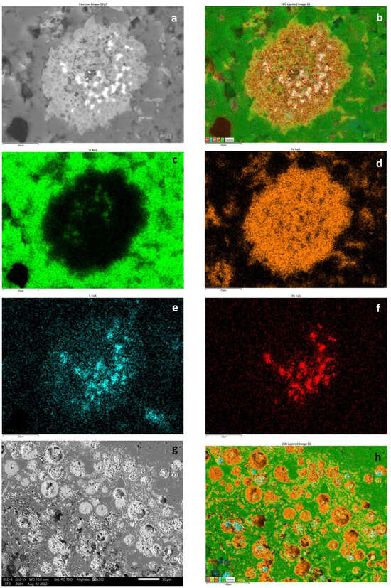 Mineralized cross cuts of hydrothermal discharge channels are characteristic of sample 1 (Figure 7f–h). Cauliflower-like and shell-like stromatolitic structures of quartz and goethite occur. In some shells, there is native sulfur (10 × 50 µm) as well as barite among fine goethite (magnetite?) grains. The shells include feldspar. Rarely, small pyrite (rarely Mn-bearing) grains are preserved. In samples 1 and 4, framboidal-like pseudomorphs occur as goethite, including barite (Figure 8a–h). Samples 4 and 9 contained carbonate matrixes, in which a mineralized microbial network could be observed. Fe-bearing infiltration also occurs with microbial biosignatures (Figure 7d). In sample 9 (peperite), altered glassy tuff occurs as greenish remnants (clay transformation) (Figure 9a). Iron and Ti with V and Mn traces are characteristic of this sample. Sample 12 contains carbonate and Fe-bearing opaque phases. In some parts, breccia-like character occurs, and mineralized microbial biosignatures are characteristic (Figure 9c,d). Decapod crustacean microcoprolite (Palaxius tetraochetarius Palik, 1965) occurs in this sample as well as in sample 13, in which crustacean coprolites also contain remnants of mineralized microbial biosignatures (Figure 9c–f). The crustacean decapod microcoprolites contain goethite with the same composition as goethite in the matrix (Figure 9c–e stars). High-resolution SEM–EDS showed the same goethite composition in the mineralized microbially mediated microtexture (Figure 9e,f). All the microcoprolites have similar mineral compositions to those of the carbonate host in which they occur.