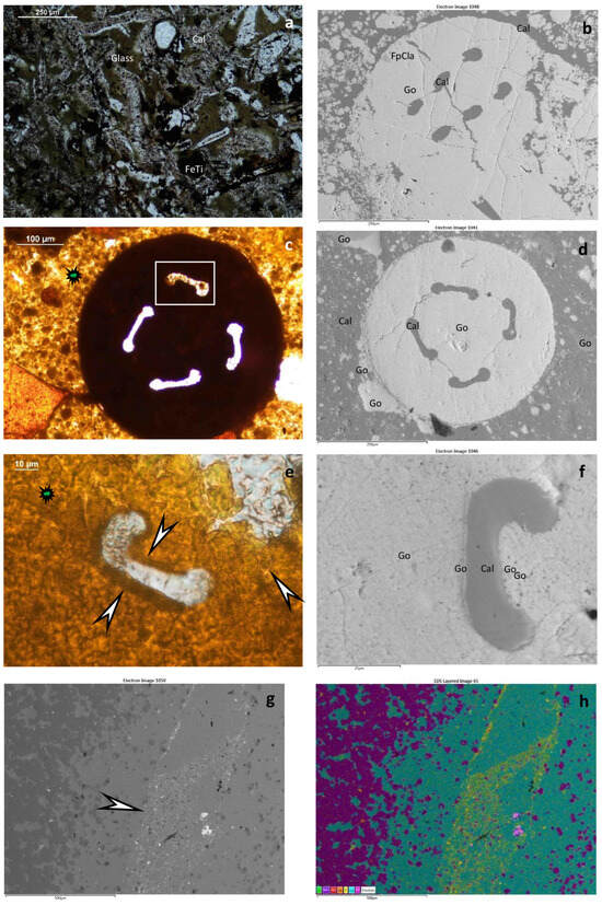 Peperite, crustacean microcoprolites, and biomat in merged segregated quartz and carbonate host. (a) Peperite, including volcanic glass (Glass), calcitized altering glass (Cal), and Fe-Ti opaque minerals; transmitted light, 1 N; sample 9; (b) crustacean microcoprolite Favreina hexaochetarius Palik, 1965, BEI by SEM–EDS; sample 13, legend: Go-goethite; Cal-calcite; FpCla-feldspar-clay mineral; (c) Goethite-bearing microcoprolite Palaxius tetraochetarius Palik, 1965, transmitted light, 1 N; sample 12; (d) Image of Palaxius tetraochetarius Palik, 1965 (c), BEI by SEM–EDS, legend: Go-goethite; Cal-calcite; (d) Enlarged ventral channel of P. tetraochetarius; and (c) with brown, woven goethite-rich mineralized microbial biosignatures shown by arrows, transmitted light, 1 N, sample 12. All the microcoprolites have similar mineral compositions to those of the carbonate host in which they occur. As shown in (c,e), the host material is similar to the coprolite material in terms of microtexture (mineralized microbially produced texture, filamentous with sequestered inner forms), mineral composition, and elemental composition, as are the trace elements in goethite (S and P); (f) BEI determined by SEM–EDS (e), legend: Go-goethite; Cal-calcite; (g) Biomat in merged segregated quartz and carbonate host, BEI by SEM–EDS, sample 13; (h) Composed elemental map of (g), color legend from left to right: Ti, Mn, Ba, Fe, P, Ca, Si (P yellow, and Ti, Mn, Fe refer to biomat).