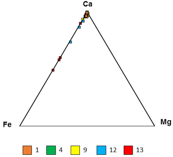 Triangle diagram of carbonate composition. The color numbers refer to the samples described in Table 1.