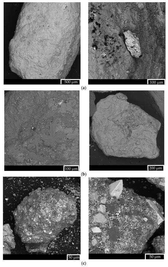 As shown in Table 1, ASW has a significant yield of fine grades, with 93.37% represented in the −45 µm fraction. When beneficiating material in this size range, it is very difficult to produce a concentrate of suitable quality. Analysis of the various size grades was carried out using a Vega 3 LMH electron microscope (TESCAN, Brno, Czech Republic) equipped with an Oxford Instruments (Oxfordshire, UK) INCA Energy 250/X-max 20 energy-dispersive microanalyzer. Micrographs of the particles are shown in Figure 1.