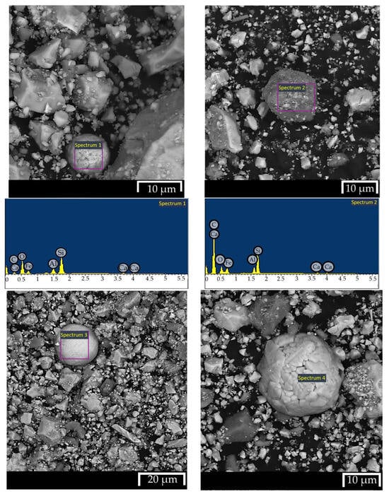 Analysis of the data shown in Figure 10 shows that low-magnetic and aluminosilicate iron-containing microspheres were detected in the concentrates obtained on the established regime for high-gradient separation with the application of scanning electron microscopy. The composition of the microspheres is summarized in Table 3. Interpretation of the results shows that the detected microspheres are mainly composed of Al, Si, Ca, and Fe. At the same time, microspheres representing iron oxides were detected (Figure 10, spectrum 4). Thus, the presence of low-magnetic and aluminosilicate iron-containing microspheres is confirmed, which agrees well with the results of earlier studies [22,48]. It is also worth noting that the sizes of extracted particles of valuable components with low values of magnetic susceptibility (less than 15 microns) are in good agreement with the work [49], in which the application of a high-gradient separator for sludge beneficiation is justified. The possibility of their extraction into the magnetic product using high-gradient magnetic separation is also proven.