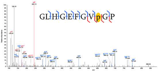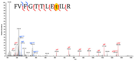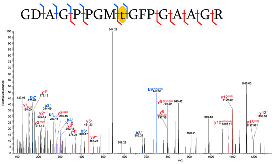 Figure 2. Phosphorylation of threonine in a peptide of collagen I (α2). The placement of the phosphorylation mass shift [+80] (highlighted in yellow) was isolated to a single residue by detection of the y9++, y9−H20, y9−NH3, b8+, and b9−H20 fragment ions. As is typical for PSMs of peptides bearing phosphorylation [29], we see some ions with a [−98] mass shift, consistent with the neutral loss of phosphoric acid during the fragmentation process. Blue denotes b- fragment ions and red denotes y- fragment ions.