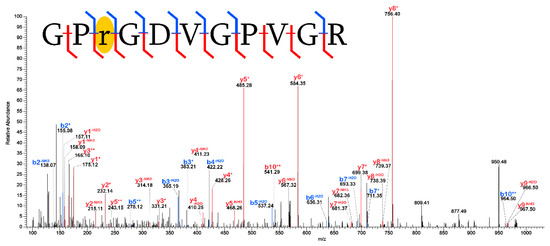 Figure 7. Dihydroxy methylgloxal adduction on an arginine residue in a peptide of collagen I (α2). The placement of the [+72] mass shift is robustly isolated to a single residue by identification of the b2+, b2−NH3, b3+, b3−H2O, y8+, y8−H2O, y8−NH3, y9−H2O, and y9−NH3 fragment ions and is highlighted in yellow. Blue denotes b- fragment ions and red denotes y- fragment ions.