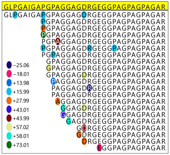 Hydroxylation[+16]: Hydroxylated proline (Hyp), a biological PTM that is crucial for the formation of the triple helix in collagen I [11] and routinely found in preserved collagen sequences (e.g., [12,13]), was identified in 14 collagenous α-chains and 1 NCP (collagen + calcium-binding EGF domain-containing protein). The majority of these proteins simultaneously displayed instances of oxidative damage to Hyp residues (see Section 3.2.3). A few occurrences of doubly hydroxylated proline[+32] were also identified.