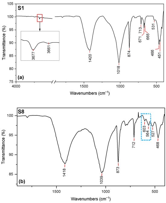 The distinctive vibrations of talc separate samples S1 and S3 from the rest in the dataset. In Figure 2a, the infrared spectrum of sample S1, spanning the range from 4000 to 400 cm−1, reveals notable peaks attributed to calcite and talc. The highlighted spectral region within the red rectangle exhibits a sharp band at 3677 cm−1, signifying the stretching mode of Mg3OH, and a very weak band at 3661 cm−1, indicative of the Mg2Fe2+OH stretching vibration, suggesting a minor iron presence in this mineral. These bands are characteristic of talc. Additional distinguishing features of talc manifest in the 1200–400 cm−1 range, with well-defined absorption bands associated with Si–O and OH group vibrations. The most prominent band, taking on a distinct shape at 1018 cm−1, is assigned to the in-plane Si–O stretching mode. The absorption band at 671 cm−1 corresponds to the bending vibration of the OH groups (Mg3OH), while a slightly lower position at 665 cm−1 reveals an absorption band linked to the iron content in talc. The band around 531 cm−1, appearing as a shoulder, is connected to the perpendicular Mg-O vibration mode, and the bands at 466 and 451 cm−1 arise from the translation vibrations of the OH groups and the Si–O–Si bending vibrations, respectively [].
