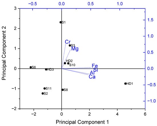 Figure 3 displays the PCA score plot of the analyzed decorations in the space defined by the first two principal components (PCs), which collectively account for 77.99% of the total variance. Specifically, PC1 contributes 57.64% and PC2 contributes 20.35% to the overall variance. The loading plot indicates that PC1 is primarily influenced by Al, Si, Ca, and Fe, whereas PC2 is influenced by Mg and Cr.