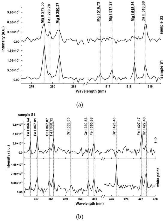 On the other hand, sherds S1 and S3 exhibit the highest positive values on PC2, indicative of a higher content of Mg and Cr in these specific sherds. The spectral features showing the elevated content of magnesium in the white decoration are depicted in Figure 4a. It compares two sections of the LIBS spectra obtained from one of these sherds (S1) and a sherd without a magnesium increase (S2). It is evident that the magnesium spectral lines in the white decoration of sherd S1 exhibit higher intensity than the corresponding spectral lines in the decoration of sherd S2. The heightened magnesium content in the decorations of S1 and S3, in comparison to the slips, implies the utilization of magnesium-rich minerals as the white pigment.