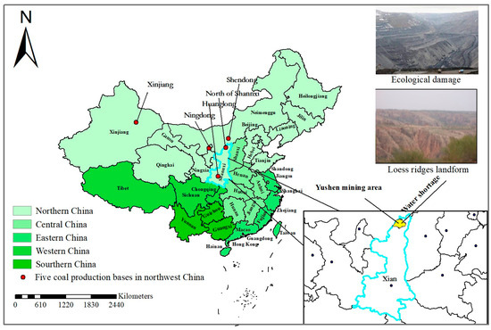Coal mining generates underground goaf, which poses a significant risk of geological disasters, including land collapse, groundwater depletion, and a host of ecological and environmental problems. Statistical data reveal that the land subsidence area caused by coal mining has already exceeded 4000 km2, with an estimated loss of 2.04 t of groundwater for every 1 t of coal extracted [1,2,3]. The Northwest District serves as the primary coal production base in China, with five major coal production bases established in Shendong, Ningdong, Northern Shaanxi, Huanglong, and Xinjiang, as illustrated in Figure 1. These regions collectively contribute to one-third of China’s coal production. The northwestern region’s challenges, including a dry climate, sparse vegetation, and limited water resources, result in a meager 3.9% contribution to the country’s overall water resources. The intensive mining activities have severely impacted local water resources, with groundwater levels dropping by more than 15 m in areas exceeding 306.8 m2 in the Yushen mining area alone. The conflict between a fragile ecological environment, acute water scarcity, and high-intensity mining continues to deepen. The ecological problems faced by coal mining in various regions of the world are very similar, taking the waste of water resources caused by mining as an example. Hill et al. set up 11 monitoring points in the coal mining area of the Northern Appalachian Plateau Region of western Pennsylvania and found that the decrease in groundwater level caused by mining is a common phenomenon [4]. Karaman et al. targeted the southern part of the Illinois Basin in northwest Saline County, Illinois, where longwall coal mining water level drops may reach tens of meters. They proposed a new one-dimensional flow equation to estimate aquifer parameters with minimal cost. In this way, the groundwater levels of longwall coal mining could be predicted [5]. Howladar focused on the Barapukuria coal mining area, Dinajpur, Bangladesh. Through direct field investigation, questionnaire survey, and laboratory analysis, Howladar understood the impact of underground coal mining on the water environment of the mining area and confirmed that the water level in the mining area was almost depleted. From 2001 to 2011, the overall water level decreased by more than 5 m [6]. Robertson studied the governance and sustainability of groundwater in Australian coal mining areas [7].