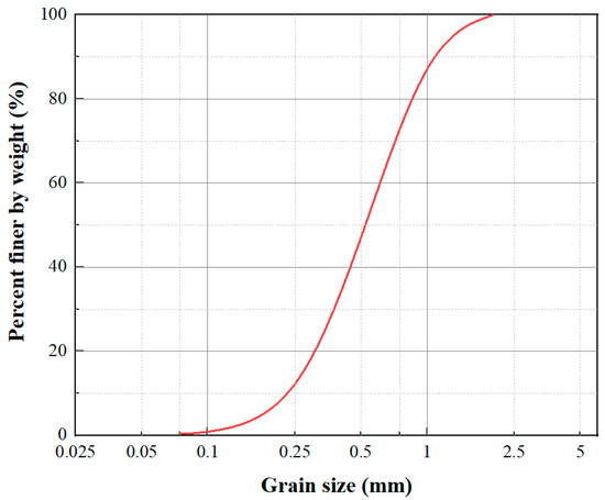 The soil samples employed in this experiment were procured from the Yushen mining area. In accordance with the specifications outlined in GB/T 50123-2019 (Standard for Geotechnical Test Methods) [25], the soil samples collected from the designated sampling area underwent thorough testing to ascertain their fundamental physical properties. Figure 2 depicts the grading curve which visually represents the distribution of particle sizes in the soil. The majority of the samples exhibit sizes ranging from 0.5 to 1 mm, and the coefficient of non-uniformity (Cu) is measured at 3.08, indicating coarse sand with inadequate grading. In addition, the parameters of the sand, such as maximum and minimum dry density, organic carbon, and salt content, are shown in Table 1. X-ray diffraction analysis of sand samples showed that the main component was silica. MDI Jade 6.5 software was used for phase identification.