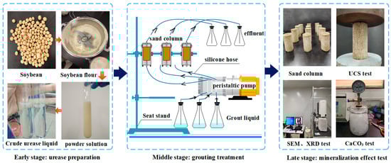 The test scheme was shown in Table 2. The overall process of the experiment is shown in Figure 3. The experiment was divided into an initial stage (urease preparation), middle stage (grouting treatment), and final stage (mineralization effect test). Crude urease extracted from 40 g/L soybean powder solution was used in the EICP test, and urease activity was 5.2 mM/min. Sand columns obtained from the supernatant of 40 g/L soybean powder solution have the highest strength, and urease slurries obtained by centrifugation are not prone to blockage, which can better balance the curing effect and economy [8,9]. As per the findings of Yuan et al. [15], the concentrations of peptone, yeast powder [28,29], and skimmed milk powder [30,31] in the three organic materials were established at 2 g/L, 4 g/L, and 6 g/L, respectively. The cementation solution concentration was 1 mol/L of urea and calcium chloride. The pH was adjusted to 9.0 with a low concentration of NaOH solution, and the grouting rounds were set to 5 rounds. In each scheme, the volume of each injected solution was 50 mL, which was about 1.5 times the pore volume of the sand column. Three parallel samples were set for each scheme.