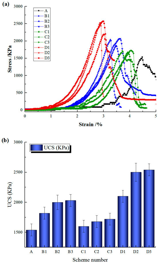 (a) Stress–strain curves for different schemes; (b) UCS peak value of different schemes.