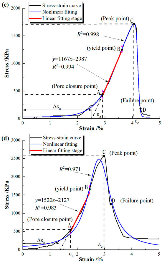 Elastic modulus and Poisson’s ratio were calculated from the stress–strain curve of the linear elastic stage. is the peak strain and is the intersection point between the stress–strain curve in the linear elastic stage and the transverse axis, where m can be considered as the slope and is initially set to 14.2. Finally, the stress–strain fitting curves of samples A, B3, C3, and D3 were successfully obtained, as shown in Figure 6. Taking the D3 sand column with the best reinforcement effect as an example, the fitting explanation was given by fitting the equation at its linear elastic stage; calculating , , , , ; and finally fitting the stress–strain curve throughout the entire process using Origin 2018 (9.5) software.