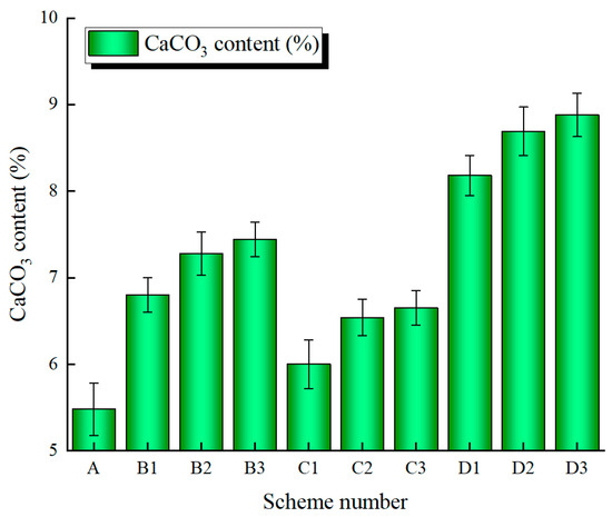 The content of calcium carbonate in the sand columns is shown in Figure 7. The content of calcium carbonate in scheme A was 5.48%, while the content of calcium carbonate in scheme EICP combined with organic materials was significantly higher than that in scheme EICP alone, reaching a maximum of 8.88%, which indicates that organic materials can promote the formation of calcium carbonate to some extent. For the same organic material, the higher the concentration of organic material, the higher the content of calcium carbonate, but the increase of 6% is close to that of 4%, which indicates that the concentration of 4% organic material can achieve a better balance effect of calcium carbonate. A comparison of schemes B, C, and D showed that under the same concentration, the calcium carbonate content of the schemes was D > B > C, indicating that skimmed milk powder had the largest incremental effect on calcium carbonate, followed by peptone and yeast powder.