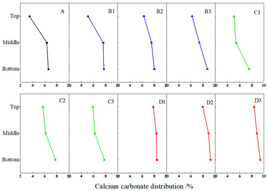 In order to evaluate the uniformity of calcium carbonate distribution in the sand column, the calcium carbonate content was measured in the upper, middle, and lower areas of the sand column, following the methods of Cao et al. [39]. Figure 8 show cases the findings, with calcium carbonate content represented on the horizontal axis and the sand column area (top, middle, and bottom) on the vertical axis. As the data points progress towards the right, calcium carbonate content demonstrates a gradual rise. In scheme A, the difference between the top and bottom reaches 3.1%, which is a large gap, indicating that the distribution uniformity of calcium carbonate in traditional EICP is poor. The disparity in calcium carbonate levels between the upper and lower portions of calcium carbonate in schemes B, C, and D is less significant compared to scheme A. This suggests that the inclusion of organic materials enhanced the even distribution of calcium carbonate within the sand columns. The discrepancy in calcium carbonate content between schemes B1, B2, and B3 and C1, C2, and C3 is approximately 2% and 2.5%, respectively. Similarly, the difference in calcium carbonate content between schemes D1, D2, and D3 is around 1%. This indicates that skimmed milk powder has the most substantial impact on the uniformity of calcium carbonate distribution in sand columns, while peptone and yeast powder also contribute to improving the uniformity of calcium carbonate distribution. Furthermore, in all schemes, it is evident that calcium carbonate content is generally higher at the bottom compared to the top and middle sections. This is due to the injection of grouting into the bottom of the sand column and the more extensive distribution of solution at the bottom caused by gravity. As a result, calcium carbonate content is higher at the bottom than that at the top and middle sections.