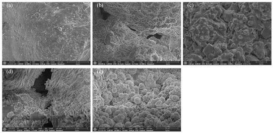 SEM images of the sand are shown in Figure 9. Figure 9a shows the original sand grains. It can be seen that the sand grains have distinct marks and corners, and the grain surfaces are relatively smooth. Figure 9b shows the EICP-cemented sand particles. The surface of the sand particles is covered with crystal particles, which cement the loose sand particles into a whole, but the crystal particles do not form an obvious stacking form and are distributed evenly on the surface of the sand particles. The sand cemented by EICP combined with peptone is depicted in Figure 9c, where the resulting crystal particles exhibit a denser clumpy aggregation form. The SEM of EICP combined with yeast powder is shown in Figure 9d, and the surface of the sand particles is distributed with calcium carbonate crystals of different sizes. The SEM images of EICP combined with skimmed milk powder are shown in Figure 9e. The crystal particles present multiple couplings, including not only a cluster aggregation form but also a rod form. In Figure 9c–e, calcium carbonate crystal particles show different aggregation forms, which may be formed by small calcium carbonate particles wrapped around bacteria or organic materials.