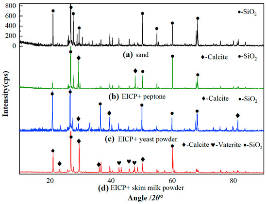 XRD results: (a) original sand; (b) EICP combined with peptone; (c) EICP combined with yeast powder; (d) EICP combined with skimmed milk powder.