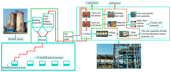 From Figure 1, the tailings slurry from the beneficiation plant was first pumped to the tailings comprehensive utilization base, where it will be screened twice by meshes. The first level of screening uses a 60-mesh vibrating triple screen, and the products on the screen are sold as finished fine sand in concrete. The secondary screening uses a 160-mesh vibrating triple screen, and the products on the screen are transported to the magnetic separation apparatus through a belt. The magnetic material will be removed to improve the whiteness of the tailings. The tailings with high whiteness can be used as the primary raw material for ceramics and glass. Moreover, the removed iron-containing tailings can then be used as fine iron powder raw materials. After sedimentation and pressure filtration of the tailings slurry from secondary screening, the tailings can be used as a raw material for industrial unburned ceramic granules, bricks, cement, etc. The other portion of the tailings slurry can still be delivered to the mine backfill station, and the tailings deep-cone thickener can be used to raise the underflow concentration of the ultra-fine tailings (UT). Finally, the cementitious materials, water, and UT are mixed uniformly by the mixing system, and then transported to mined-out areas by means of self-flow or pumping. So, all of the tailings in surface stockpiles can be effectively handled, and there is no need for a new tailings pond.