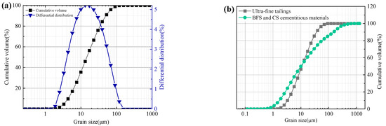 Grain size distribution of raw materials: (a) the cumulative and incremental curves of UT, and (b) the cumulative curves of UT and BFS and CS mixed cementitious materials.