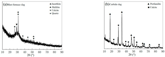 The laser particle size analyzer and XRD were used to determine the mineral compositions and grain size compositions of the blast furnace slag (BFS) and carbide slag (CS) mixed cementitious materials, respectively, and the results of the tests and analyses are shown in Figure 2b and Figure 3. The particle size range of mixed cementitious materials is 0.48–630.96 μm, with a median diameter of 11.48 μm and a specific surface area of 1.3 m2/g, as can be seen in Figure 2b and Table 1. Moreover, from Figure 3a and Table 2, BFS is primarily composed of the minerals: quartz, calcite, melilite, and anorthite. It also contains significant amounts of CaO, SiO2, and Al2O3, which together make up 83 wt.% of BFS. Calcite and portlandite make up the majority of CS, while CaO accounts for 87.45% of its total content.