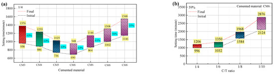 The initial and final setting times of ultra-fine tailings cemented backfill slurry (UTCBS) are depicted in Figure 4 as a function of the admixture dosages, mass concentration, and cement-tailings (C/T) ratio. From Figure 4a, while maintaining the quantity of calcium chloride (CC) added, the initial and final setting times of UTCBS were shortened with the addition of more sodium silicate (SS). As described in Section 3.4.1 by microscopic characteristics, the addition of SS produces more calcium silicate, which fills and shortens the spaces between the ultra-fine tailings (UT) particles. It is obvious from all of the samples that the UTCBS samples’ setting times lengthen as the mass concentration falls. This is primarily because adding more water will cause the distance between slurry particles to expand, making it difficult for the internal mesh structure of the ultra-fine tailings cemented paste backfill (UTCPB) to form. Similar to how UTCBS’s initial and final setting times rise as the C/T ratio drops. This phenomenon can be explained by the fact that less cementitious material means fewer hydration products, which is bad for the coagulation and solidification of the interior structure. Visually, we can see from Figure 4 that UTCBS’s C/T ratios have a greater impact on the initial and final setting times of the slurry than UTCBS’s mass concentration. The initial and final setting times apart increased by 456 min and 600 min as the slurry mass concentration decreased from 63% to 57%, but apart increased by 1128 min and 1670 min as the slurry C/T ratio decreased from 1/4 to 1/10.