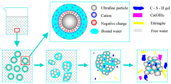 The ultra-fine tailings (UT) particles produce a double electric layer structure as a result of the chemicals’ flotation action in the beneficiation plant, which will absorb the cations in the ultra-fine tailings cemented backfill slurry (UTCBS). The cations closer to the tailing particles are attracted more, and the cations further from the tailing sand particles are attracted less under the influence of the static stress field. The water in this electrostatic structure is known as bound water or adsorbed water film. At the same time, polar water molecules are also trapped in the electrostatic structure because of the gravitational field. The continuous stirring of the mixture during the making of the UTCBS causes the adsorbed water film on the surface of each tailings particle to transform into a common water film. Which in turn can connect numerous tailings particles together and lead to the formation of a flocculating structure of the UTCBS [32]. When UTCBS started to mix, the cementitious elements inside it started to undergo a hydration reaction. Gradually, a small amount of hydration products like amorphous gel, calcium hydroxide, ettringite, and other hydration products have been produced. The development process of the flocculation structure of UTCBS is shown in Figure 5.
