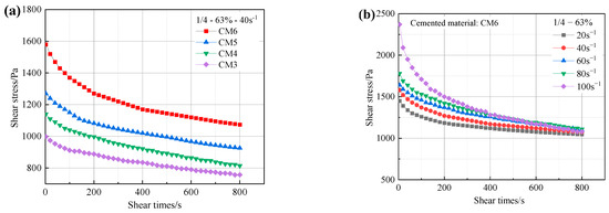 Change in shear stress of UTCBS as a function of shear time under different influencing factors: (a) admixture dosages; and (b) steady state shear rates.
