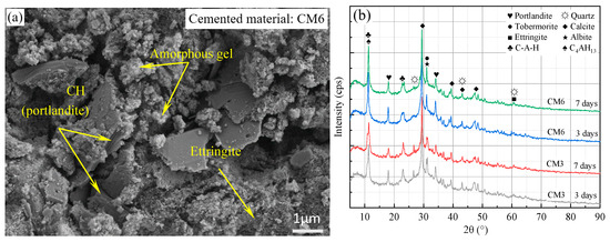Figure 9 displays the scanning electron microscopy (SEM) image and XRD spectrum of ultra-fine tailings cemented paste backfill (UTCPB) net paste samples with and without admixtures that were cured in a constant temperature and humidity curing box for 3 and 7 days, respectively. According to Equation (1) [37] and Table 2, the content of CaO in carbide slag (CS) is up to 87.45%, which offers a sufficiently alkaline environment for the ultra-fine tailings cemented backfill slurry (UTCBS). When blast furnace slag (BFS) and CS are dissolved in water, the strong alkaline environment stimulates the activity of the BFS, prompting the activation and decomposition of the BFS vitreous particles and the depolymerization reaction. At this point, the slurry system will produce a significant amount of free Ca2+, SiO44−, and AlO45−. According to Equations (2)–(4), Ca2+ adsorbed with SiO44− to produce C-S-H gels and Ca2+ adsorbed with AlO45− to produce C-A-H gels, which led to C-A-S-H gels as Ca/Si increased [38,39]. C-S-H denotes hydrated calcium silicate; C-A-H denotes hydrated calcium aluminates; and C-A-S-H denotes hydrated calcium aluminosilicate. In general, C, A, S, and H can be used to denote CaO, Al2O3, SiO2, and H2O in the chemical formula, respectively [39].