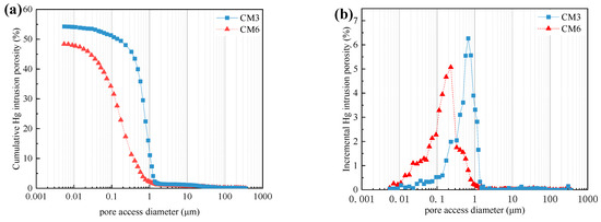 Sodium silicate (SS) is a soluble inorganic silicate that can be classified as either a solid or a liquid, this test made use of liquid SS. SS has a wide range of uses, among which is its use as an admixture for cementitious materials to improve the stability and mechanical properties of concrete [42]. Ravikumar and Neithalath [43] pointed out that the addition of SS as an alkali excitant can cause the blast furnace slag (BFS) vitreous to further dissociate, and can increase the hydration reaction degree of BFS-based cementitious materials. The early generation of precipitates like Ca(OH)2 and CaSiO3 in the ultra-fine tailings cemented backfill slurry (UTCBS), which fill the internal pores and connect some of the tailing particles during the early consolidation of the ultra-fine tailings cemented paste backfill (UTCPB), increased its early uniaxial compressive strength (UCS). Figure 11a shows that the porosity of the admixture-added UTCPB is lower than that of the admixture-unadded UTCPB. The total porosity of the admixture-added UTCPB is 48.37%, whereas the admixture-unadded UTCPB’s total porosity is 54.25%, which is consistent with the experimental results of Section 3.4.2. For example, the age of curing is 7 days, the UCS of the admixture-added UTCPB is 2.76 MPa, and the UCS of the unadded UTCPB is 1.46 MPa. That shows admixture can decrease the internal porosity of UTCPB, increasing the microstructure’s density. Additionally, the most probable pore size is used to describe the microstructure of the UTCPB. The most probable pore size of an admixture added is higher than that of an unadded one, as can be seen in Figure 11b, which was 0.23 μm (6.05%) with admixture, while it was 0.67 μm (7.12%) without admixture.